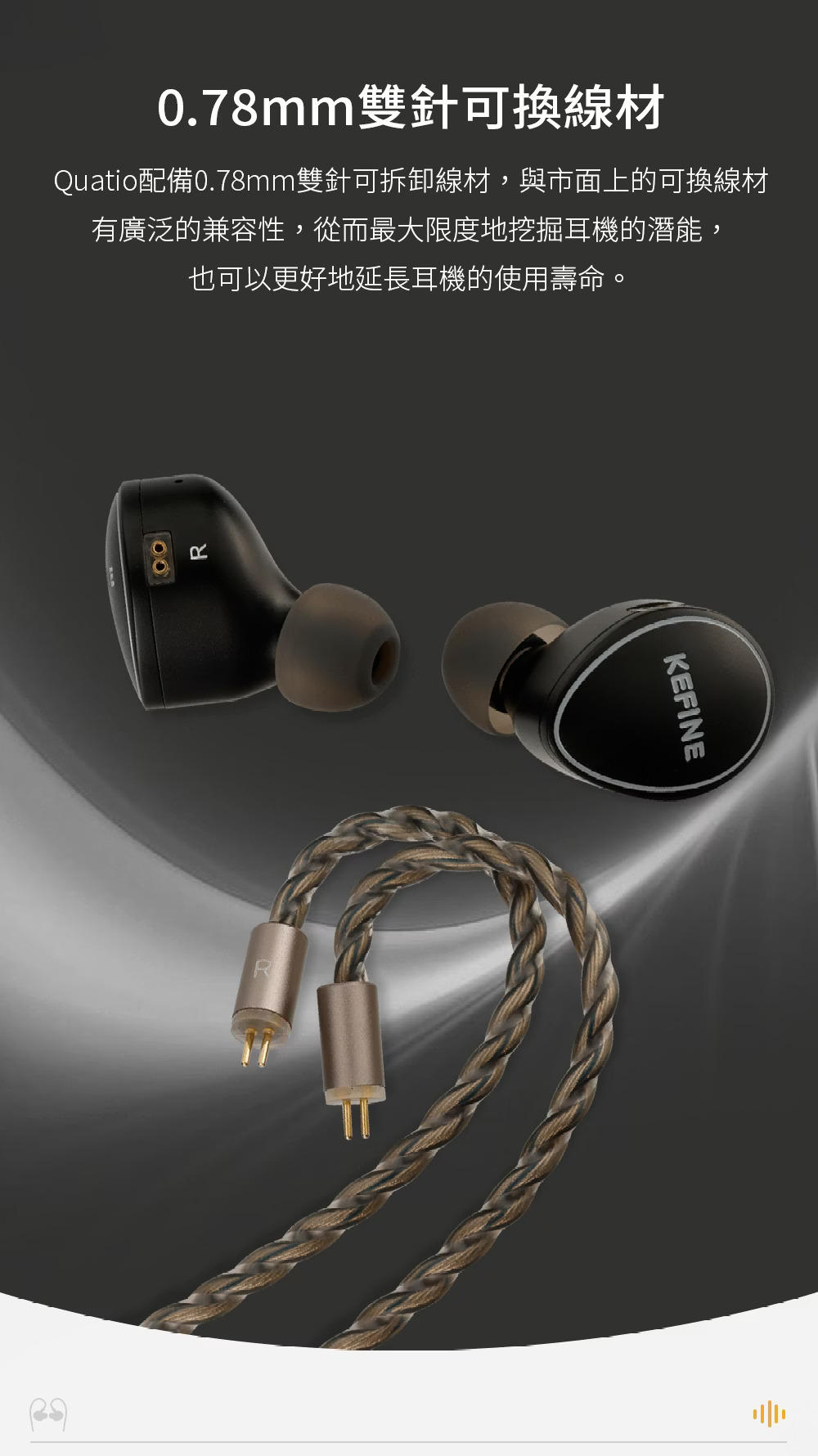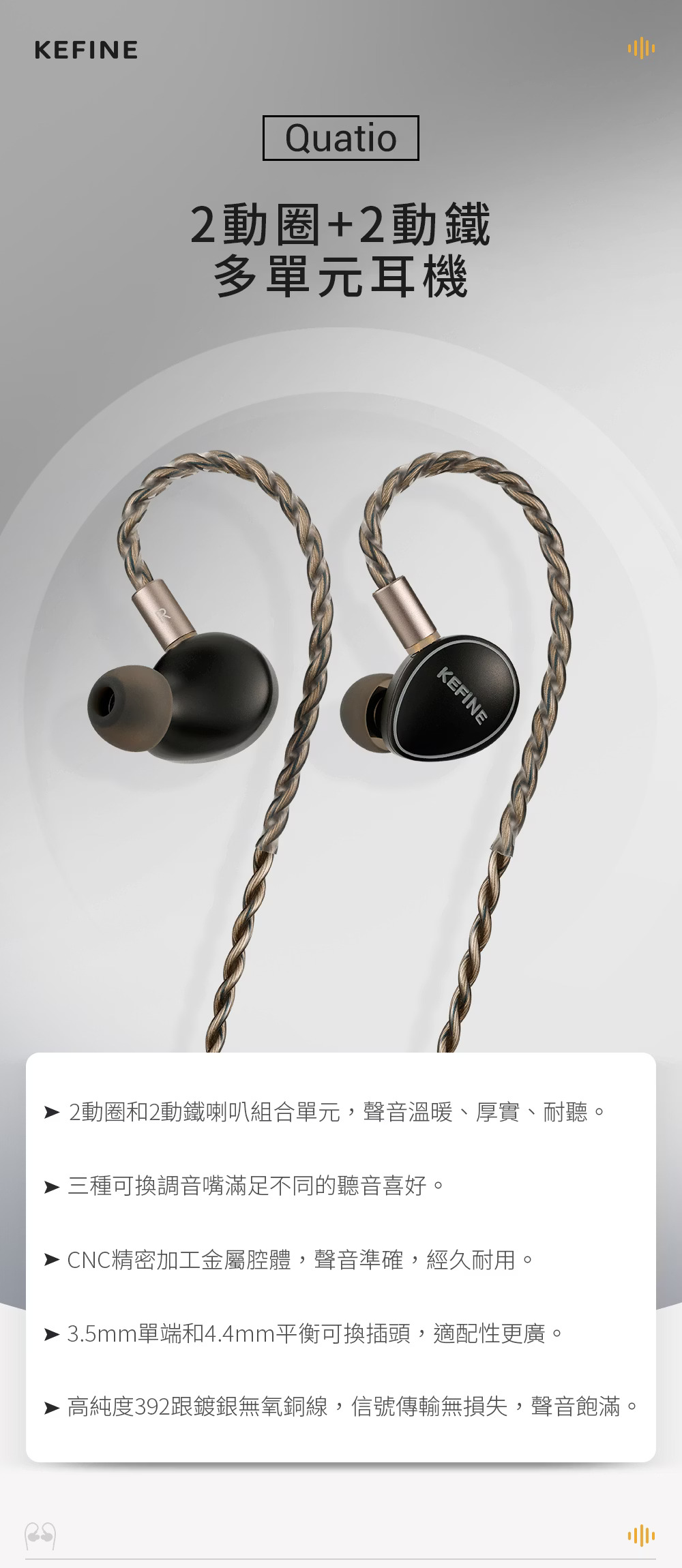Quatio 是 KEFINE 針對重視完整頻段銜接、調音可玩性與日常耐聽度所打造的多單元入耳式耳機。它採用每邊 2 動圈加 2 動鐵的混合架構,不是單純追求單元數量,而是透過不同單元的分工,建立更有層次的聲音骨架。整體定位偏向兼顧厚度、細節與適配性的綜合型 IEM,適合希望在一副耳機上同時獲得飽滿聽感、可調聲底與良好器材搭配彈性的使用者。