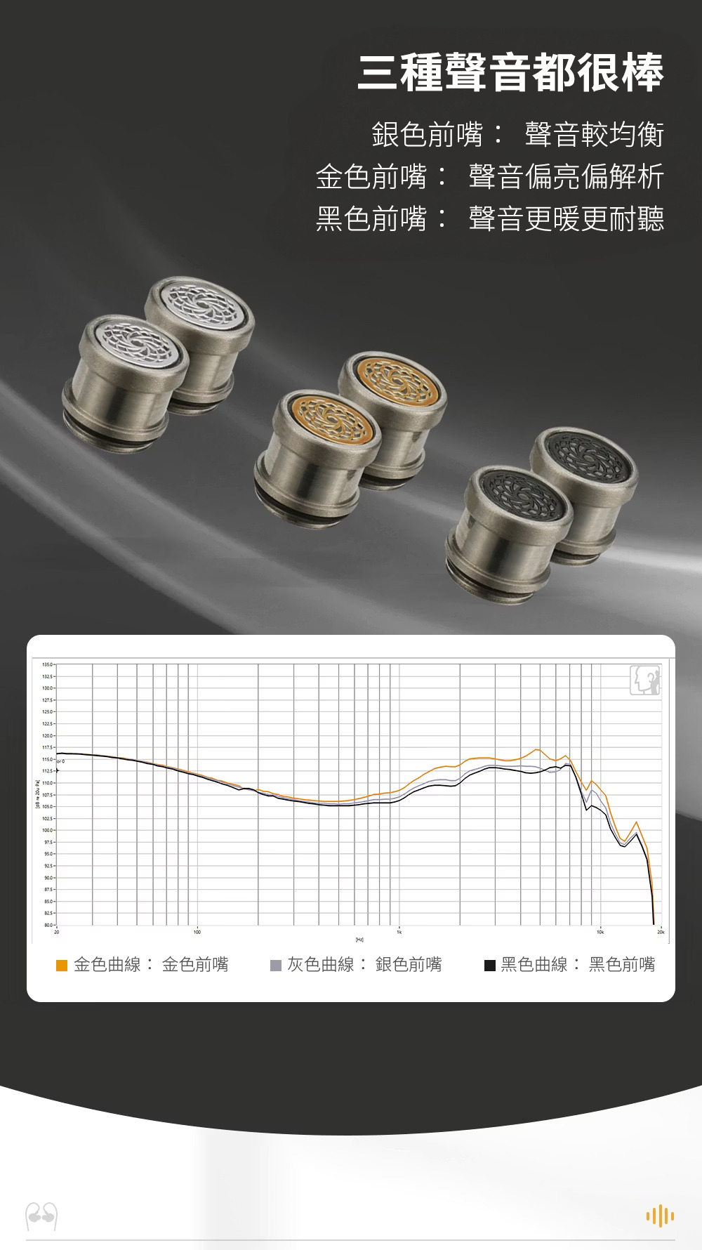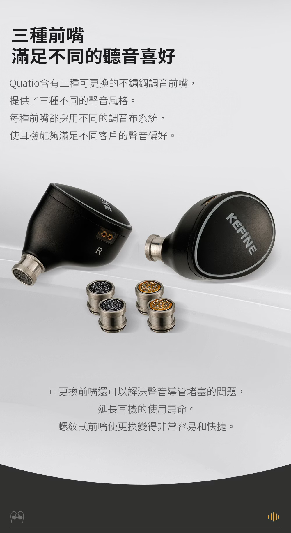 在整體聲音取向上,Quatio 的基礎方向偏向溫暖、厚實、耐聽。10mm DLC 動圈負責全頻框架,提供整體解析基礎與頻段連接的一致性,8mm PU+LCP 動圈則補足低頻量感與密度,使下盤更飽滿、有支撐力。兩顆動鐵專責 5kHz 以上頻段,讓中高頻延伸更自然,並帶出更多空氣感與細節層次。原廠同時透過三種可換前嘴提供不同調音走向,讓使用者可依偏好在均衡、偏亮解析與溫暖耐聽之間切換。