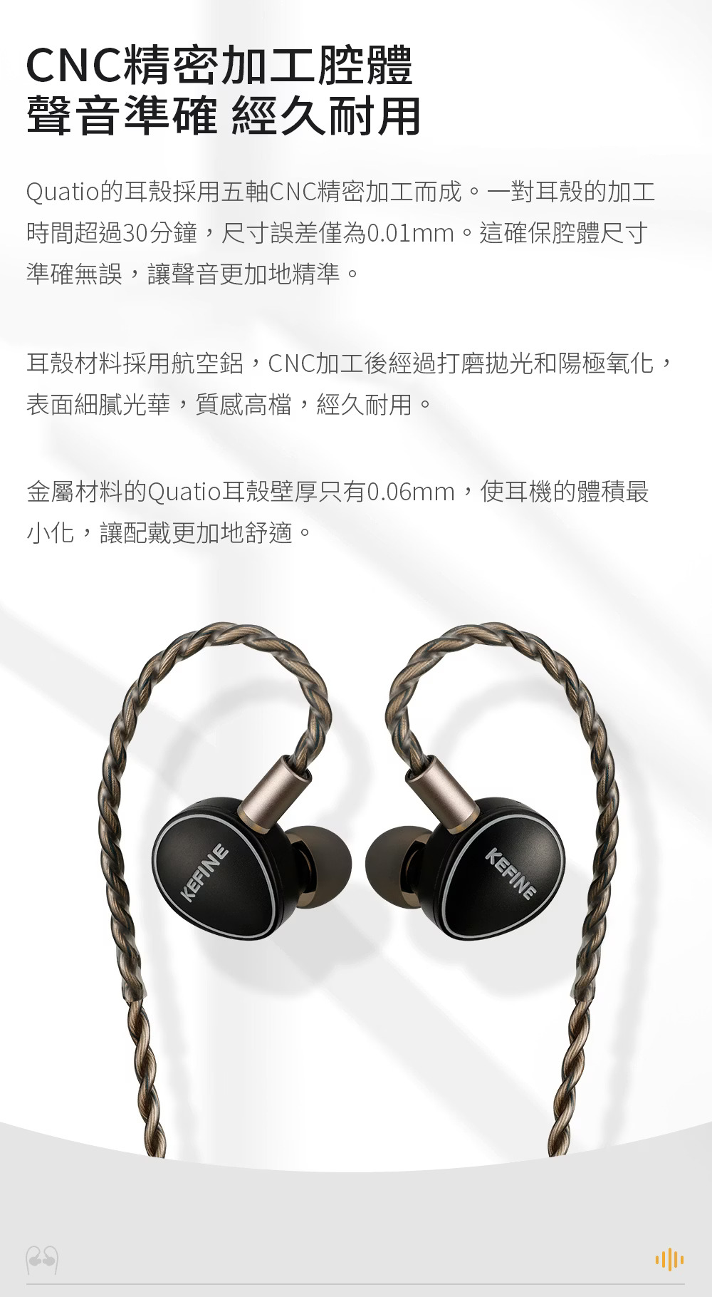 核心技術架構方面,Quatio 將 10mm 動圈、8mm 動圈與雙動鐵分為三組不同導管輸出,並搭配精密電子分頻,讓不同頻段在能量分配與銜接控制上更具條理。腔體採用航空鋁材製作,經五軸 CNC 精密加工、打磨拋光與陽極氧化處理,尺寸誤差控制在極小範圍內,有助維持腔體結構一致性與聲學穩定度。這些屬於直接影響聲學表現與機構精度的結構材質。外觀上的黑色面板與金屬邊框則主要屬於視覺與質感呈現,不能單獨視為聲音關鍵材質來源。