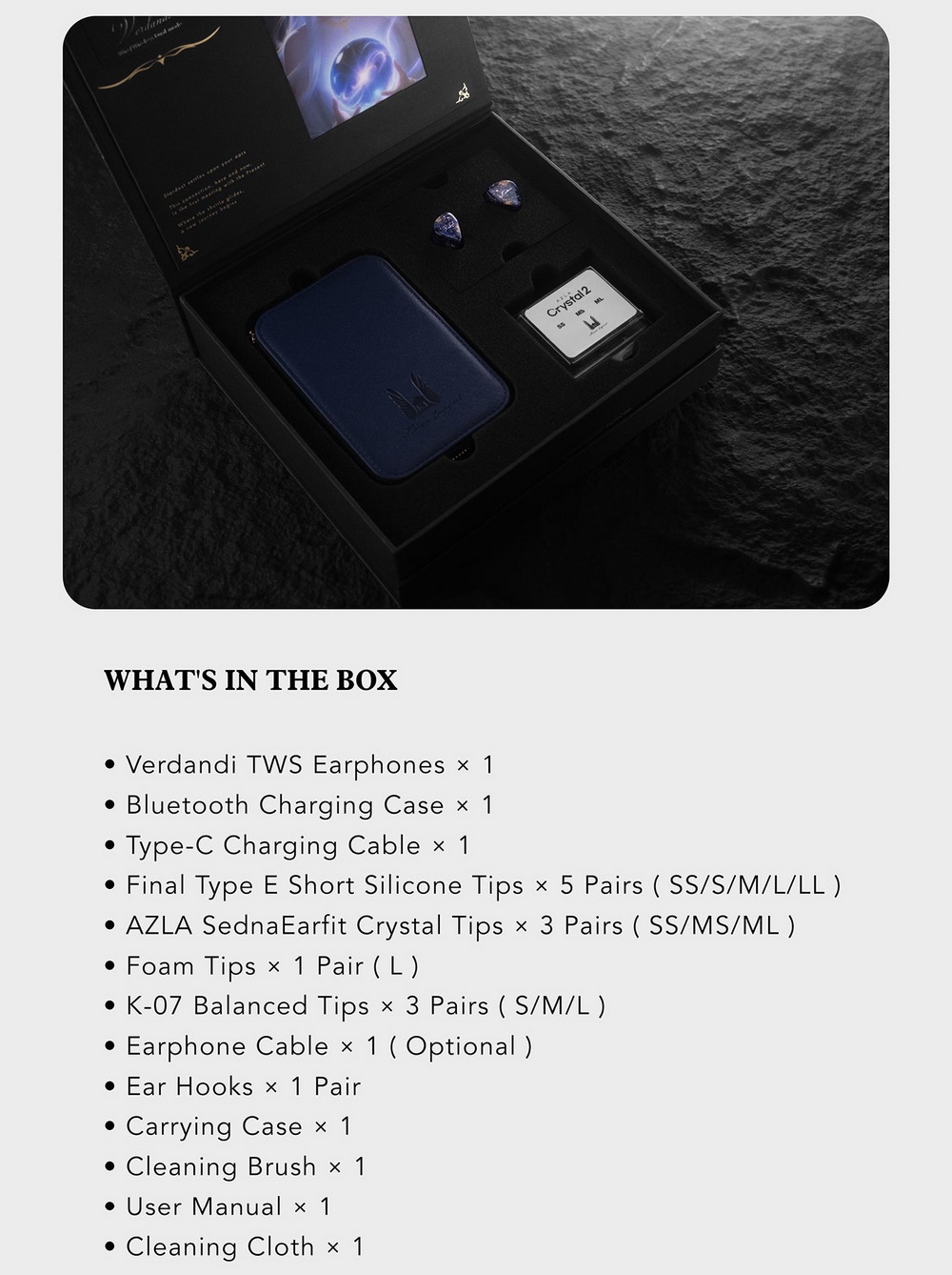 在使用建議上,Verdandi TWS 適合希望同時兼顧音質、機動性與系統延展性的使用者。無線模式適合通勤、辦公、遊戲與通話使用,內建雙麥克風降噪可提升語音清晰度;有線模式則可透過另購耳機線切換為更傳統的 HiFi 聆聽配置。配件方面除附 CNC 金屬充電盒外,也提供耳掛、Final Type E、AZLA SednaEarfit Crystal、泡棉與 K-07 等多組耳塞,方便依耳道與場景調整密合度。外殼面板的手工彩繪與金箔紋理屬外觀設計層面,主要呈現系列藝術風格與識別性,並非作為聲學結構材料描述。