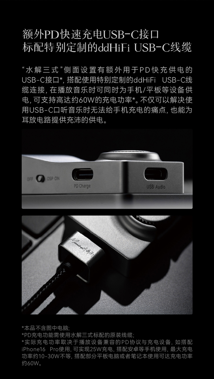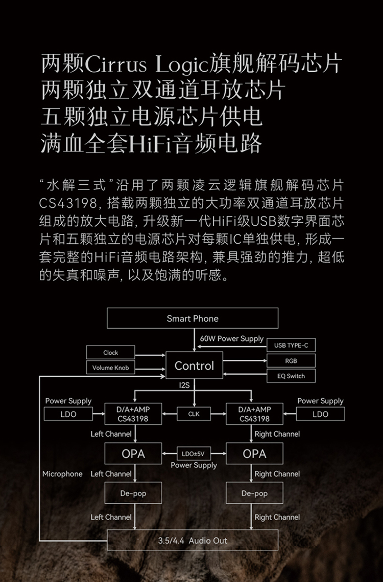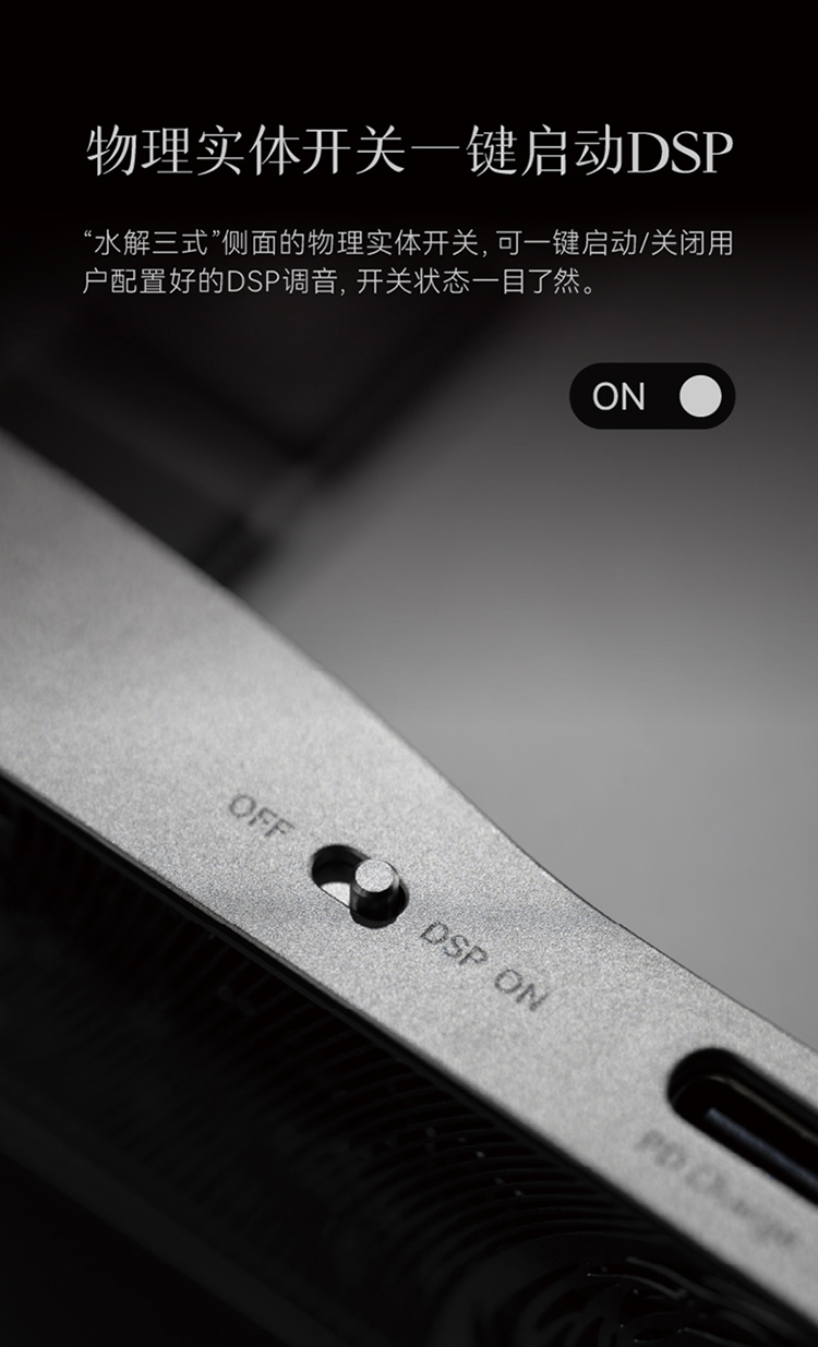 核心架構方面,水解3採用兩顆 Cirrus Logic CS43198 旗艦解碼晶片,搭配兩顆獨立大功率雙通道耳放晶片形成放大電路,並以五顆獨立電源晶片對每顆 IC 分別供電。這樣的架構能降低不同模組之間的電源干擾,提升輸出穩定性與訊號純淨度。USB 端採用新一代 USB 數位界面晶片,可支援 PCM 32Bit/384kHz 與 DSD256 音訊,側邊另設 PD 快充供電 USB-C 接口,播放時可同時為手機或平板補電,並為耳放電路提供更充沛的供電條件。
