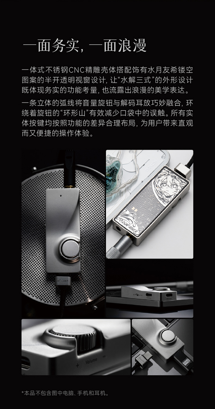 水月雨 MOONDROP 水解3 MoonRiver3 是一款旗艦級微型便攜解碼耳放一體機,設計方向以小型化機身結合完整 HiFi 音訊電路為核心。它不是單純的轉接小尾巴,而是在有限體積中導入雙 DAC、獨立耳放、獨立供電與物理操作介面,讓手機、平板與電腦都能取得更穩定的解碼與驅動能力。一體式不鏽鋼 CNC 精雕外殼提供紮實機構強度,半開透明視窗與水月友希鏤空圖案則屬於外觀視覺設計,讓產品在功能性之外也保留品牌辨識度。