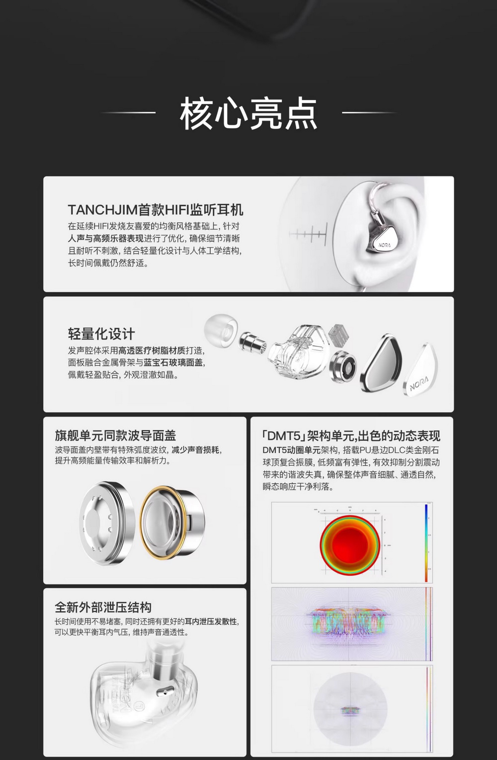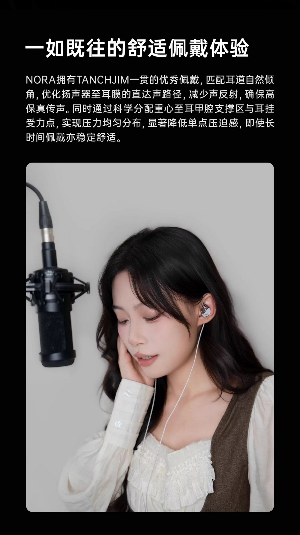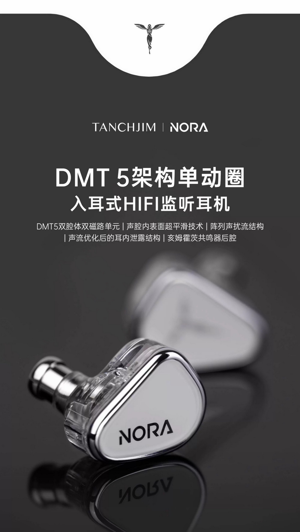 TANCHJIM NORA 是品牌首款 HiFi 監聽耳機,以均衡的調音風格為基礎,針對人聲與高頻樂器進行優化,確保細節清晰且耐聽不刺耳。NORA 採用 DMT5 架構單動圈,結合 PU 懸邊與 DLC 球頂振膜,具備彈性與剛性兼備的特性,有效吸收多餘振動,避免「金屬味」音染,帶來純淨透亮的音色。