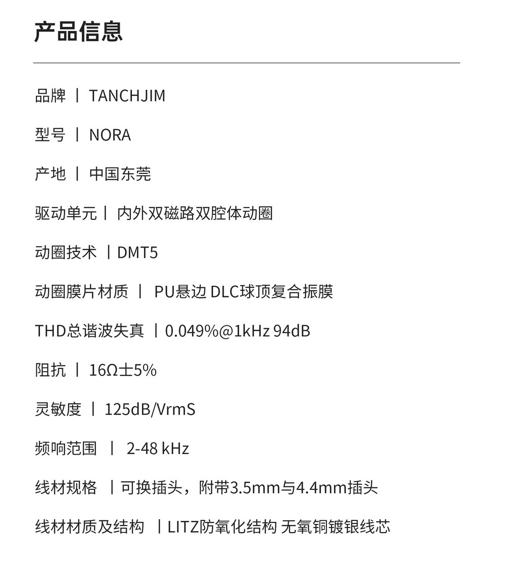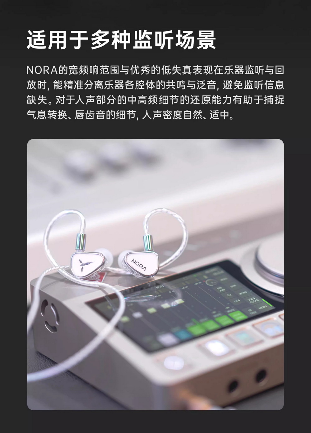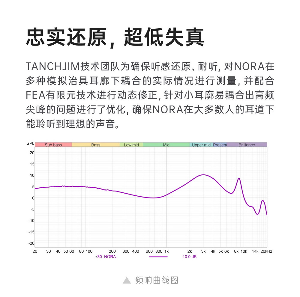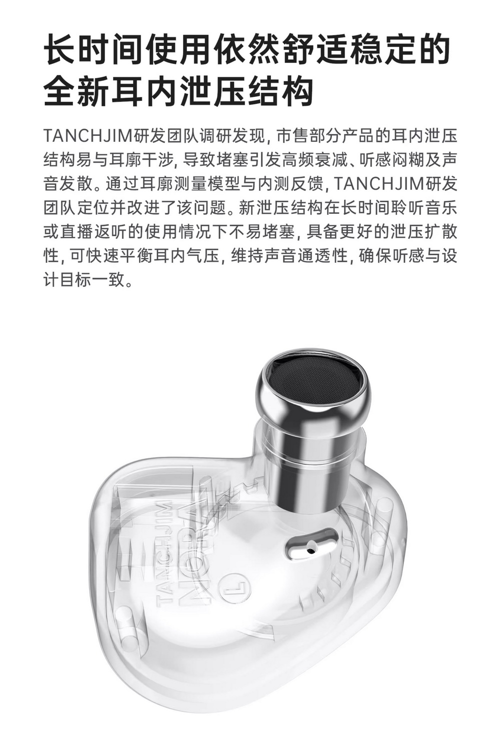 TANCHJIM NORA 是品牌首款 HiFi 監聽耳機,以均衡的調音風格為基礎,針對人聲與高頻樂器進行優化,確保細節清晰且耐聽不刺耳。NORA 採用 DMT5 架構單動圈,結合 PU 懸邊與 DLC 球頂振膜,具備彈性與剛性兼備的特性,有效吸收多餘振動,避免「金屬味」音染,帶來純淨透亮的音色。