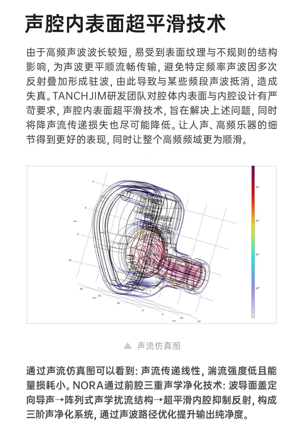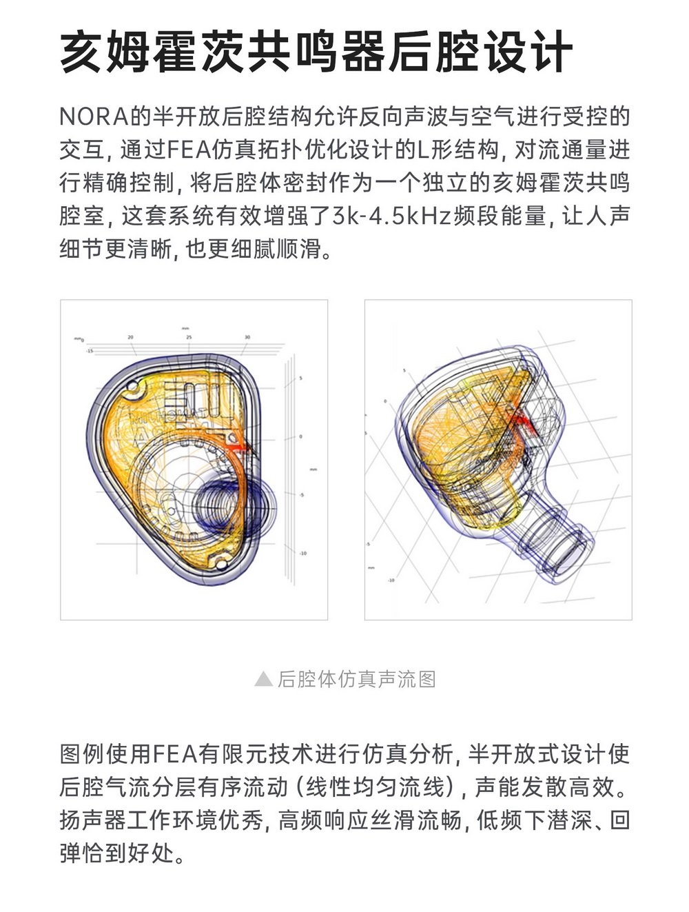 在結構設計上,NORA 內置陣列聲抗流結構,能減少聲波干涉並提升直達音質;聲腔內部表面經超平滑處理,降低聲流傳輸損耗,讓高頻更順滑自然。半開放的玄姆霍茲共鳴腔體,則進一步增強 3k-4.5kHz 的細節,讓人聲更加清晰。