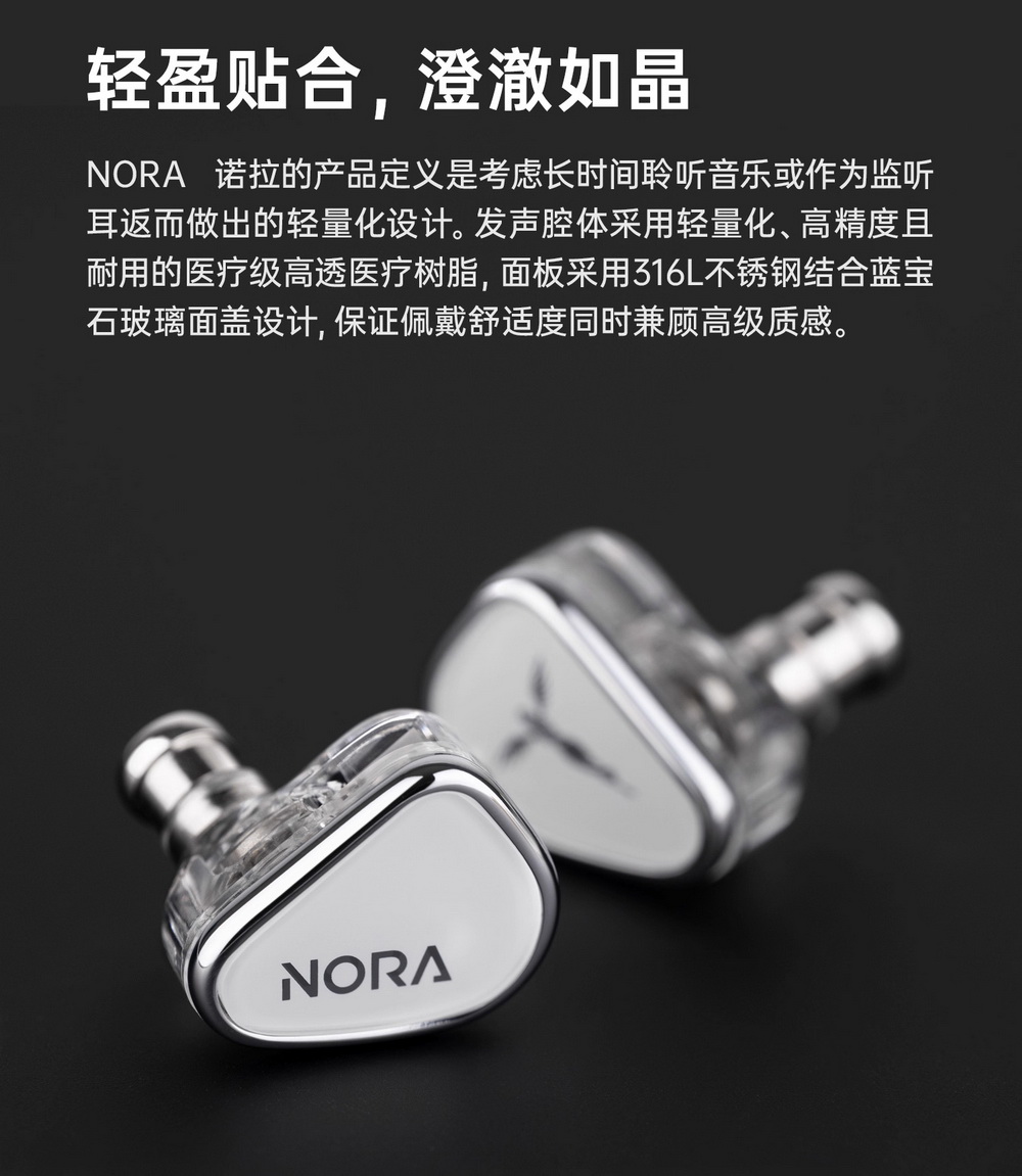 外觀部分,NORA 採用醫療級高透樹脂腔體與 316L 不鏽鋼結合藍寶石玻璃面蓋,帶來晶瑩剔透的質感,同時確保長時間佩戴的舒適度。隨附高純度銅鍍銀線材,支援 Litz 防氧化結構,並具備可換插頭設計,標配 3.5mm 與 4.4mm 插頭,滿足多場景使用需求。