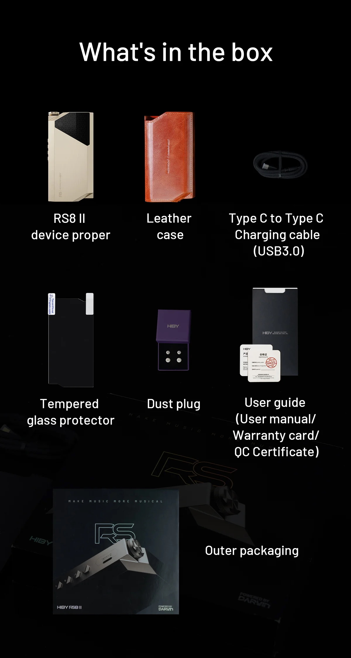 隨附配件:RS8 II 本體、專屬皮套、Type-C to Type-C(USB3.0)充電線、鋼化保護貼、防塵塞、說明書 / 保固卡 / QC、外盒包裝