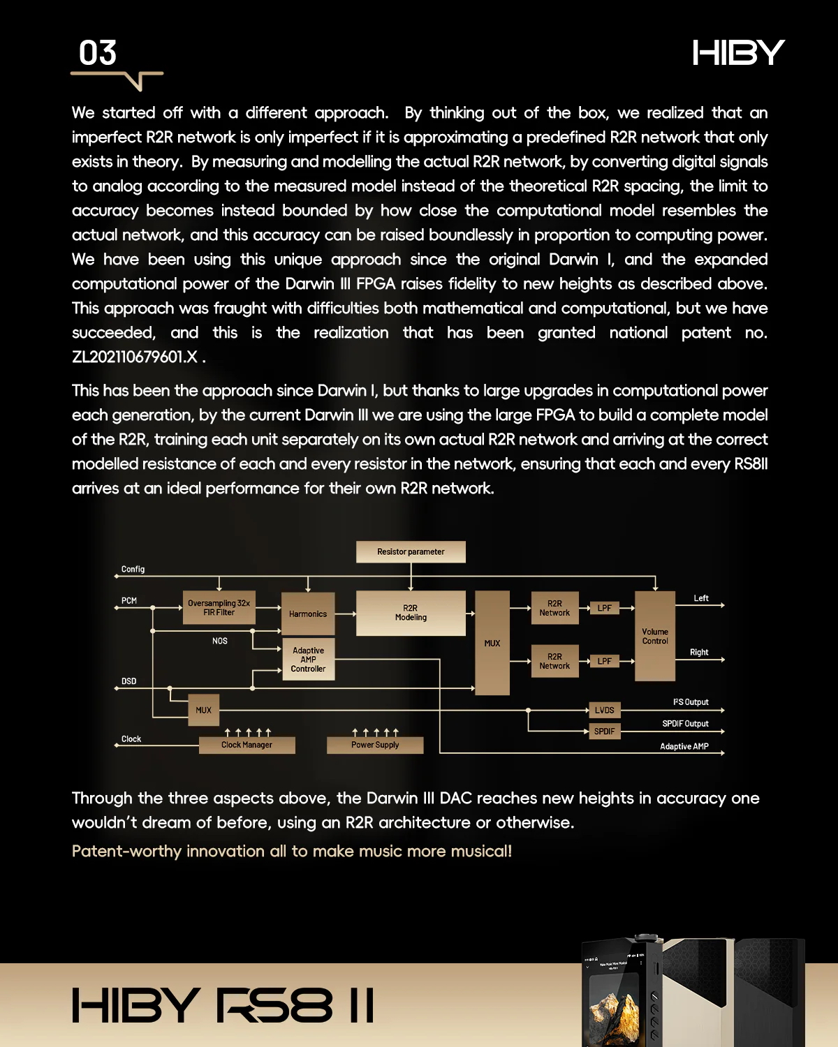 HiBy RS8 II 是 HiBy 將「隨身播放器」這個類別再次向上拉高的作品。它不只是把規格堆滿,更是把「如何讓 R2R 真正落地到隨身裝置」這件事做到了很細、很科學,也因此整組「DARWIN III」音訊鏈得以獲得國家發明專利(專利號:ZL202110679601.X),這在同級隨身播放器中非常少見。這一代的核心思路是:R2R 真正的精度不在於理論電路,而在於「實際焊上去的那一組電阻網路長得怎麼樣」。所以 HiBy 不是用一組“理論值”去算所有機器,而是這台 RS8 II 會「量測自己那一組 R2R 網路的真實數值」,再把它丟進 FPGA,做出一組對應這台機器的「真實模型」,再用這個模型去做數位轉類比。也就是說,每一台 RS8 II 都是為它自己那一組電阻網路「客製化對焦」的,精度不受傳統機械誤差限制,而是受限於 FPGA 計算能力——這就是他們說的「把誤差變成計算問題」。