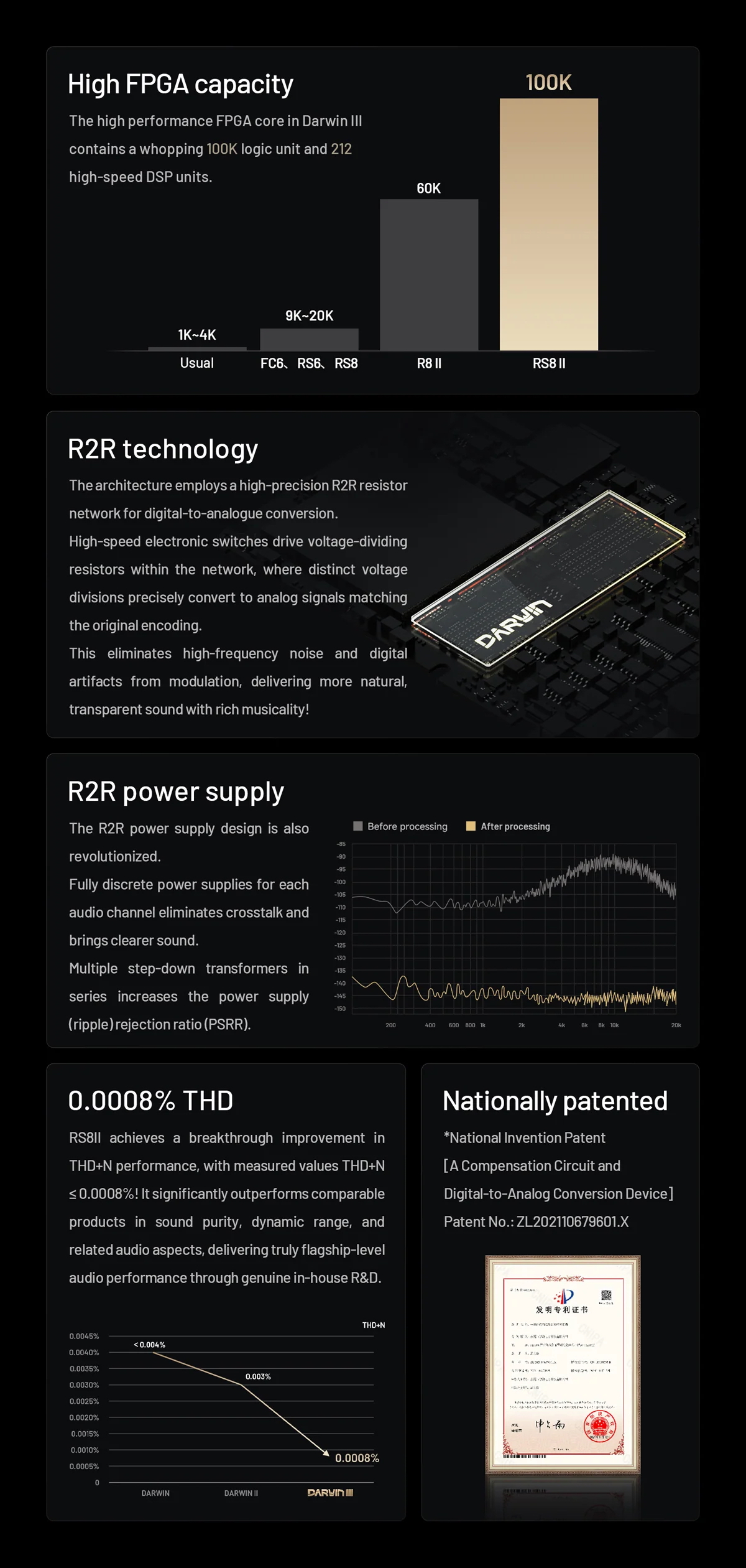 ● 第三代 DARWIN III 全音訊鏈 R2R 架構,獲國家發明專利,精準建模每一顆電阻