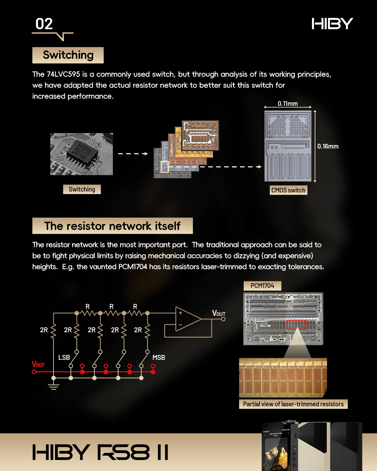 ● 切換:一般 R2R 會用像 74LVC595 這種常見晶片,但 HiBy 是反過來「先分析這顆開關的行為,再去把電阻網路做成最適合它的樣子」,所以不是硬塞通用料件,而是讓開關和實際網路是「互相匹配」的。