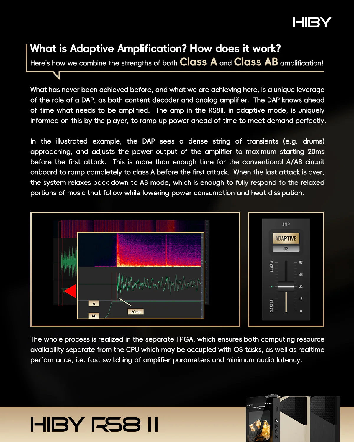 RS8 II 裡面不是單純幫你做 Class A / Class AB 二選一,而是做了一個「能聽得懂前方音樂、又能控制後方放大的」完整閉環。播放器本身就是解碼端,所以它能提前 20ms 知道「下一段音樂會不會很密、會不會鼓進來」,於是就能提早把功率推到該有的狀態——這在一般分離的 DAC + AMP 架構是做不到的。