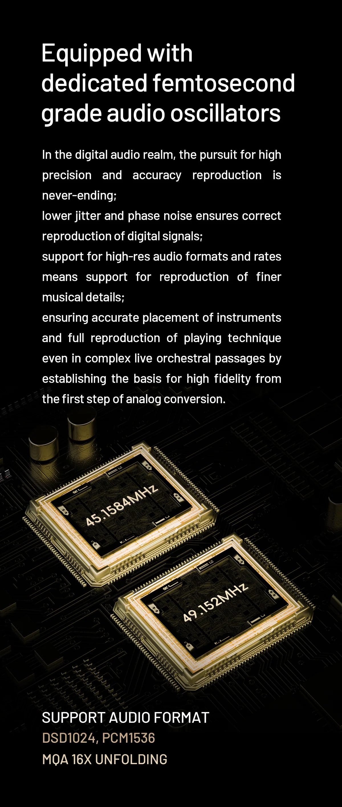 ● 雙飛秒級音訊時鐘、低相位雜訊設計,確保數位訊號正確轉換
