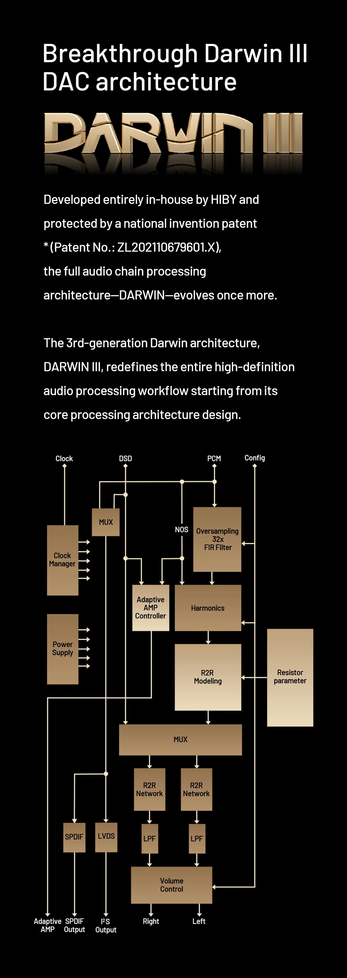 ● 電阻網路本體:傳統作法要靠極高機械精度、雷射修整電阻去追誤差(像 PCM1704 那種),但成本高又受物理限制;HiBy 的思路是「把硬體的誤差量出來→丟進 FPGA→用運算去補」,這樣就可以無限往上推準度。這個想法從第一代 DARWIN 就開始了,但到了 DARWIN III,因為 FPGA 算力更大,整個「每一顆電阻都建模」的概念才真的完全打開。