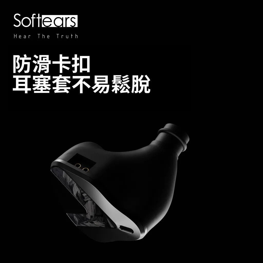 耳機外殼採用 CNC 精雕鋁合金搭配碳纖維 V 型飾片,質感精緻。出音嘴具防滑卡扣設計,避免耳塞鬆脫,配戴更安心。