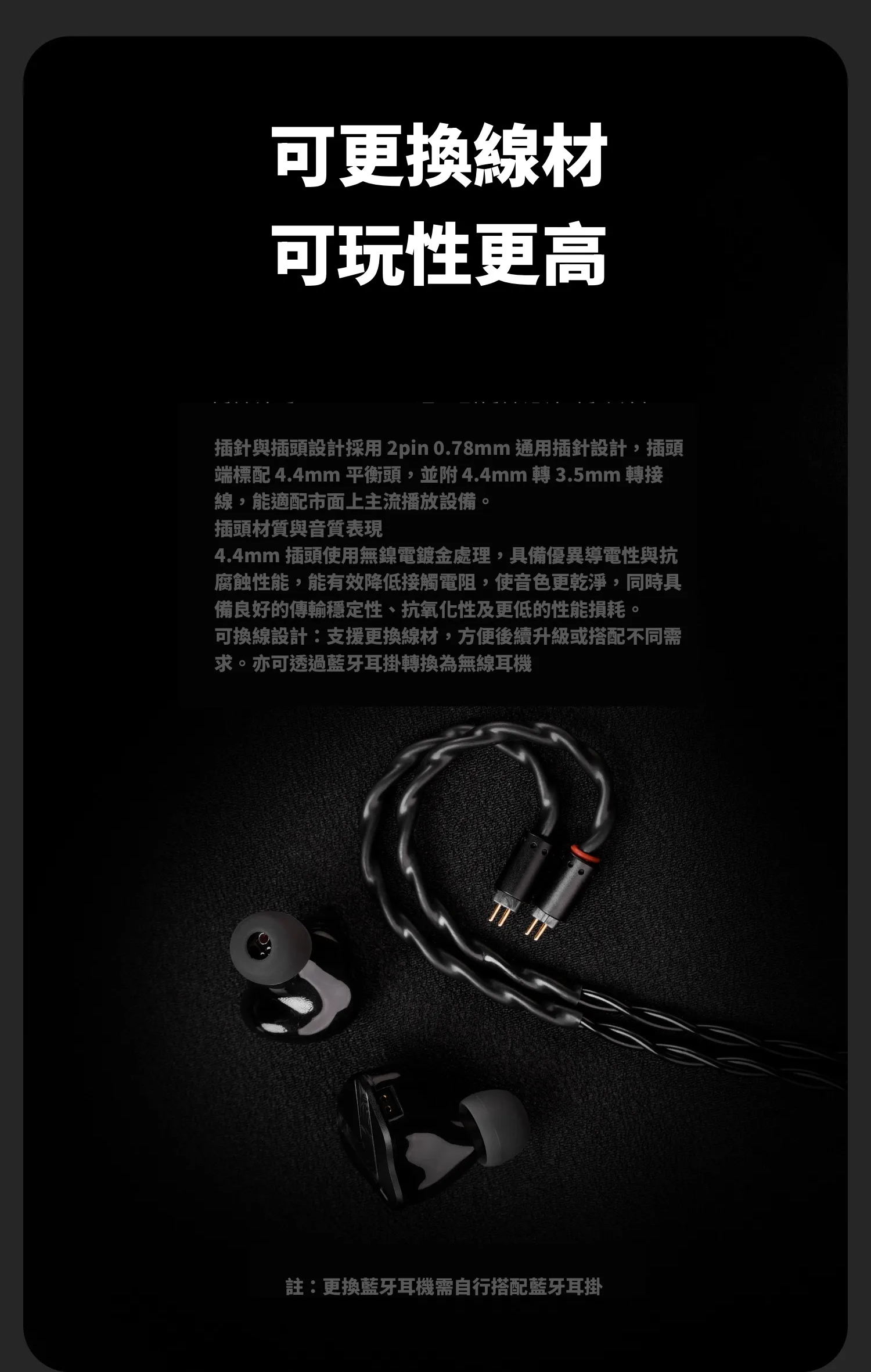 標配高純度 6N 無氧銅 4.4mm 平衡線材,經冷凍處理與精密鍍層,降低訊號損耗,確保音色純淨。支援 2pin 0.78mm 可換線設計,方便升級或改裝藍牙模組。