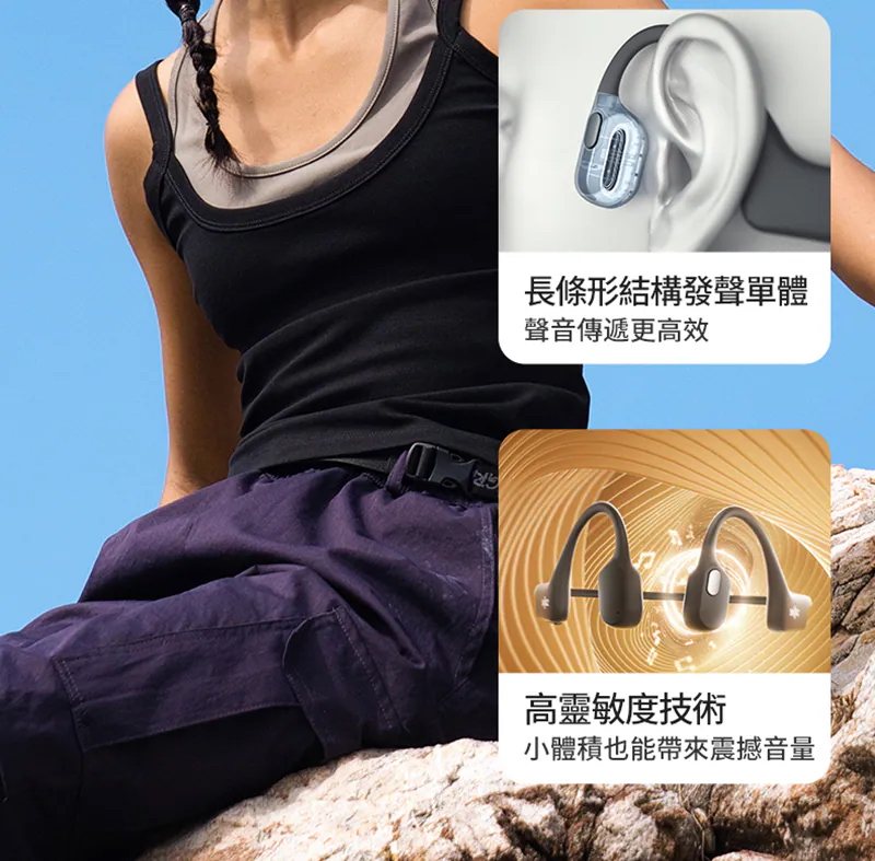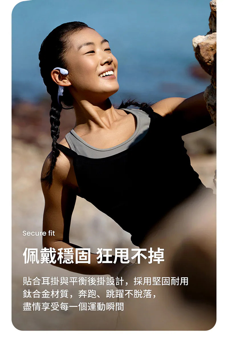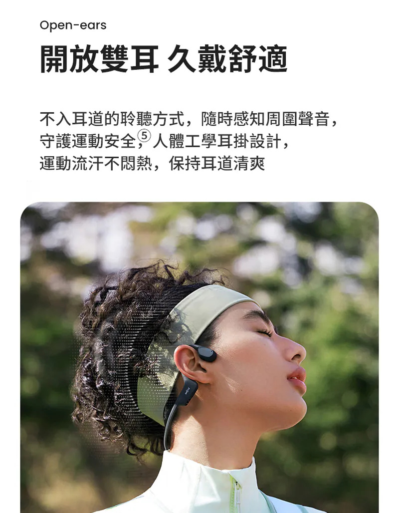 開放式設計讓你在享受音樂時,依然能隨時感知環境音,確保運動安全;26g 的輕盈機身與人體工學後掛設計,使其在長時間佩戴或高強度運動下依然穩固不脫落。