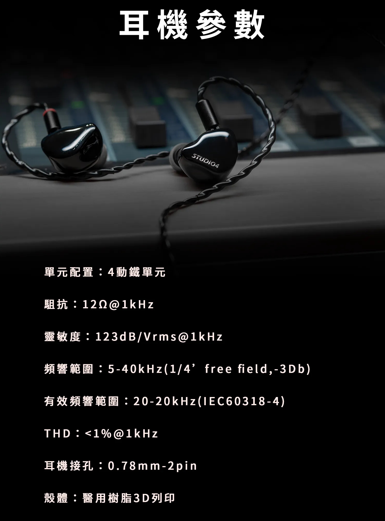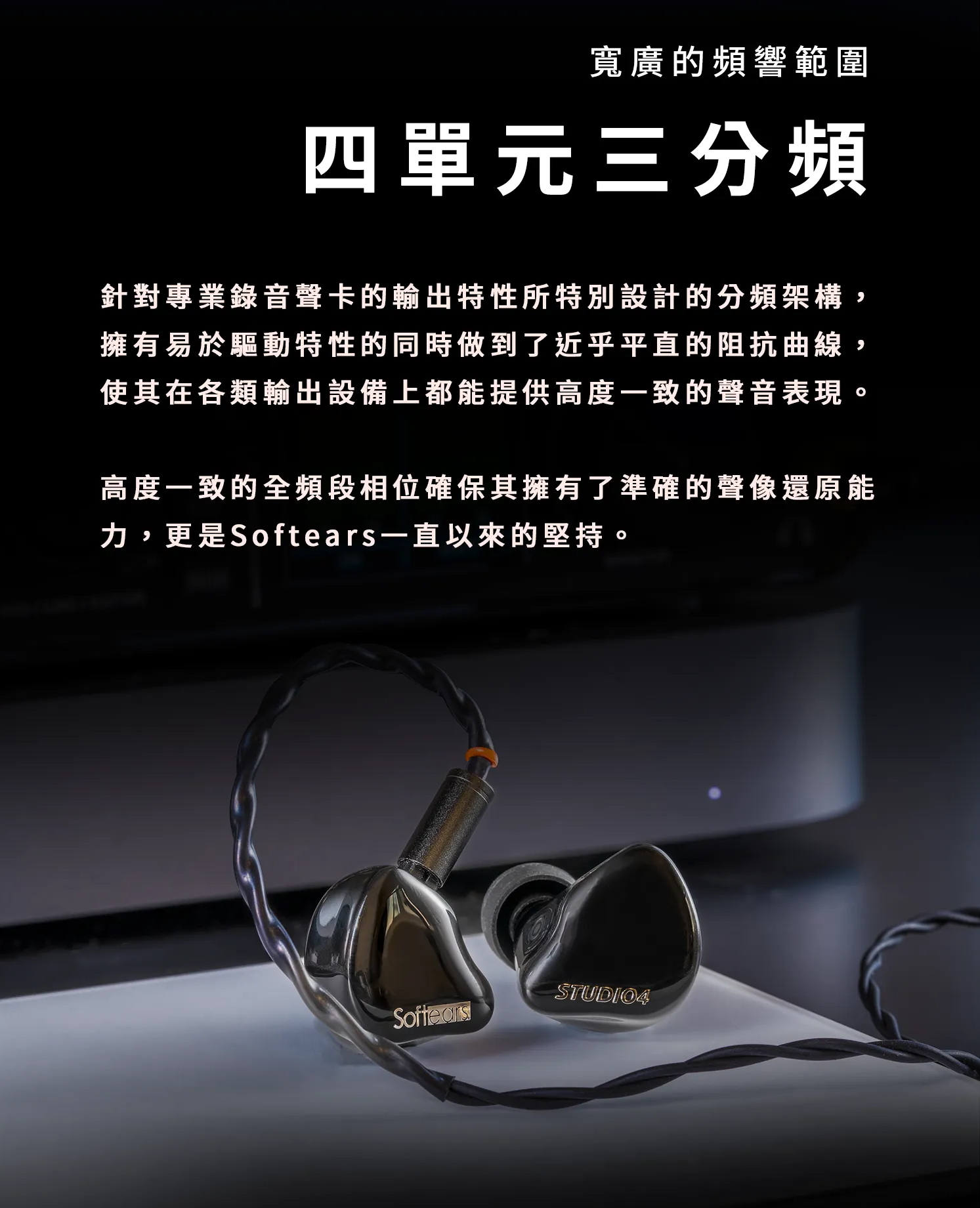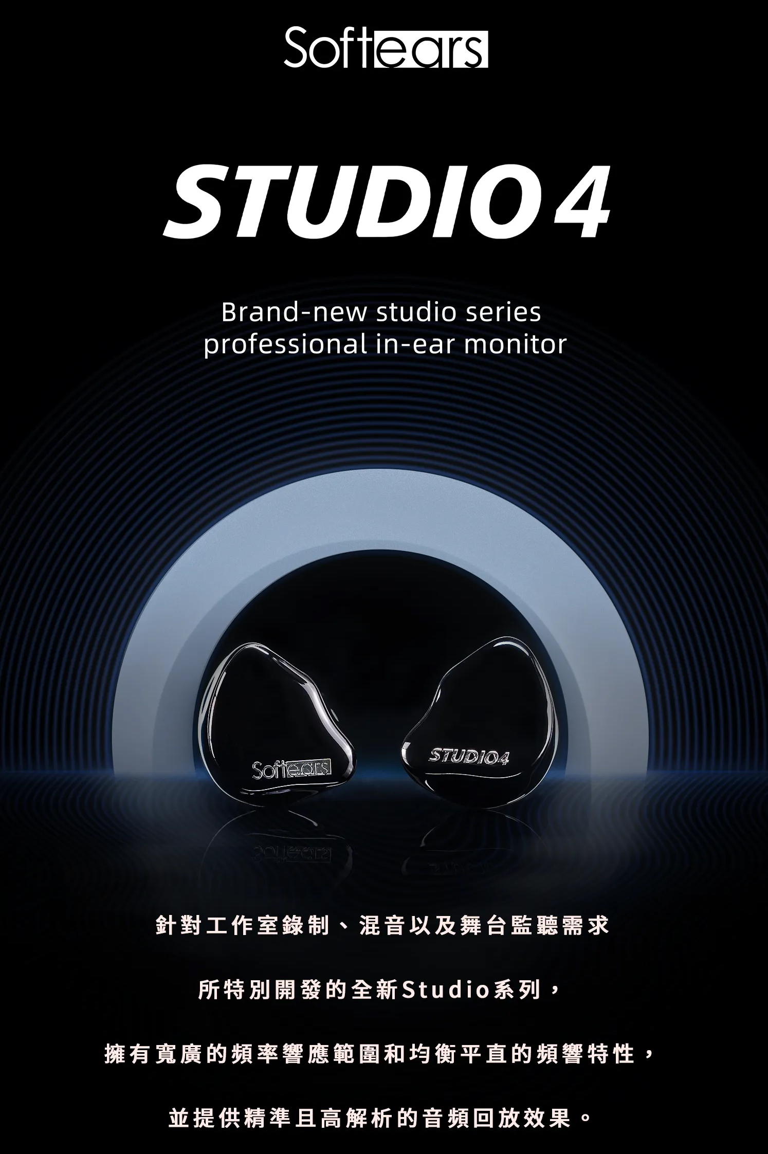 Softears Studio4 為品牌全新 Studio 系列入耳式監聽耳機,針對錄音室製作、混音與舞台監聽需求所開發。其設計核心在於提供接近中性且穩定的聲音輸出,確保在不同使用環境中仍能維持一致的音訊判斷基準。透過精密結構與聲學設計,使其具備良好的隔音效果與穩定配戴表現,適用於專業音樂製作與日常監聽需求。