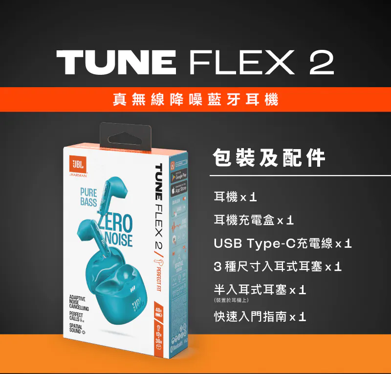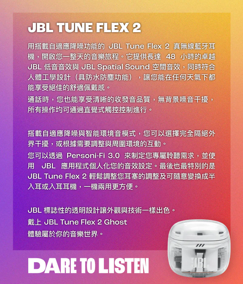 Tune Flex 2 採用自適應 ANC 主動降噪技術,能即時偵測環境噪音並自動調整降噪強度,在不同場景下維持理想聆聽狀態。