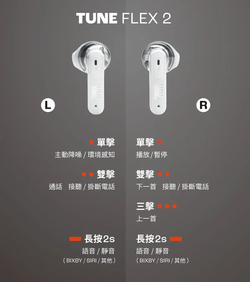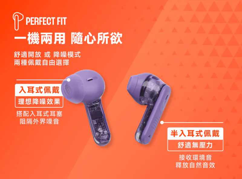 JBL Tune Flex 2 是一款結合 入耳式與半入耳式雙模式佩戴 的真無線降噪藍牙耳機,透過可替換耳塞設計,讓使用者依照不同情境自由切換聆聽方式。無論是追求完整隔音、沉浸音樂,或偏好自然通透、長時間舒適配戴,都能輕鬆應對。
