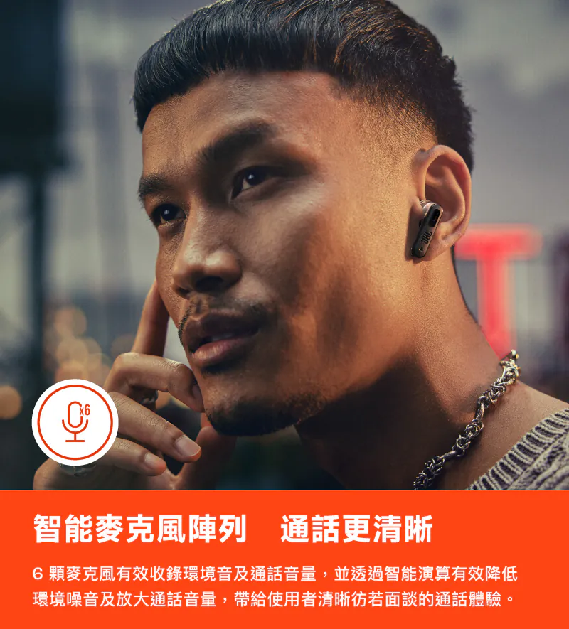 每副耳機內建 6 顆麥克風,結合波束成形、環境噪音抑制與回音消除演算法,即使在戶外或吵雜環境中,也能確保語音清晰自然。
